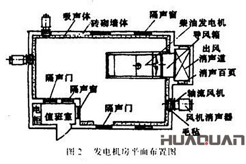華全電力認為能否解決好機組的通風散熱問題,是治理的關鍵。在機房墻上設出風口,位置對著柴油機上風扇,并安裝導風箱,將柴油機的散熱導出室外。同時,在出風口外以紅磚砌一排風消聲道,內壁面附貼外包玻璃布的巖棉,壓以鍍鋅鋼絲罩板。消聲道兩側為消聲百頁窗,使氣流流暢。這時機組的熱量可以加軸流風扇強制排風解決。進風采用兩臺軸流風扇。一般還要加裝風扇消聲器以降低縫隙漏聲。這樣室內溫度比原來降低了11℃。