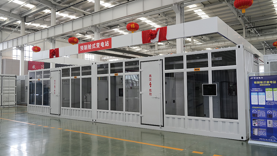 華全電力預制艙變電站,將主變、高壓配電裝置、中壓配電裝置、二次設備等預制在艙內,主要的設計、組裝、配線、調試等工作都在工廠內完成,在現場只需要進行拼接安裝即可完工,極大縮減了建設成本和周期。