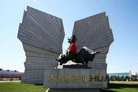 無論從火車站,還是汽車站,只要進入安達市區,首先感受到的就是她的“牛”氣。安達市標,主體由一座山石構成,用銅鑄造的九頭健牛正以排山倒海之勢,雷霆萬鈞之力劈山而沖,形成兩只巨大的翅膀,象征著安達的騰飛,翅膀高為21米。還有那的“牛街”石門,也是安達的標志性建筑。其雕塑造型則由神態各異的小牛雕嵌于整體建筑之中,虛實相應,形成一頭昂首挺立的勁牛形象。