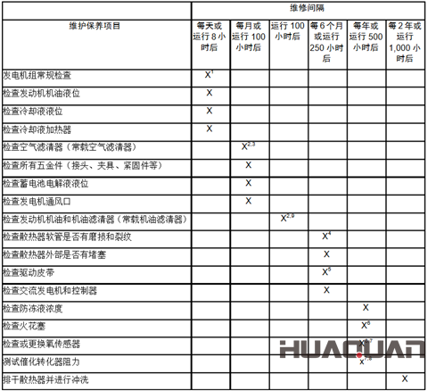 根據使用情況和環境的惡劣程度,建立一套明確的維護保養和維修時間表并嚴格遵守。下列表中列舉了備用發電機組的幾種維修間隔時間以供參考。